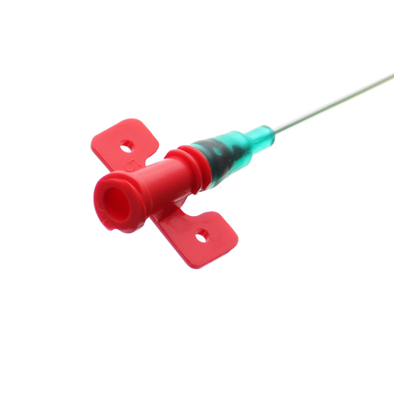 - 1 cathéter (PE) effilé à l'extrémité distale, avec un godet souple servant d'anti-plicature et une embase à ailette facilitant la fixation du cathéter avec raccord Luer-lock femelle,
