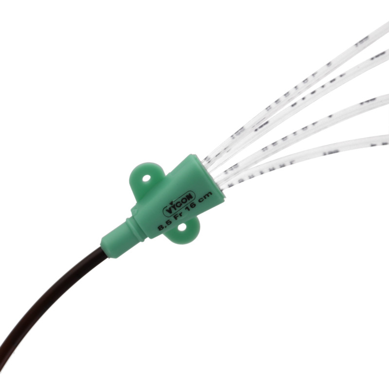 A l'extrémité proximale, les voies du cathéter sont raccordées à des tubes de jonction de différentes longueurs. Chaque tube de jonction comporte une embase de couleur différente et l’indication « Distal », « Medial 1 », « Medial 2 » et « Proximale » afin de repérer facilement les différentes lignes de perfusion.