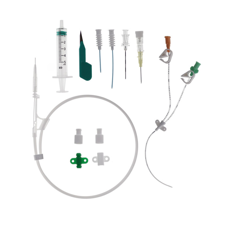 - 1 cathéter bilumière (diamètre 3 Fr) entièrement radio-opaque avec embase intermédiaire munie d'ailettes de fixation et marquage centimétrique à partir de 4 cm de l’extrémité distale.
