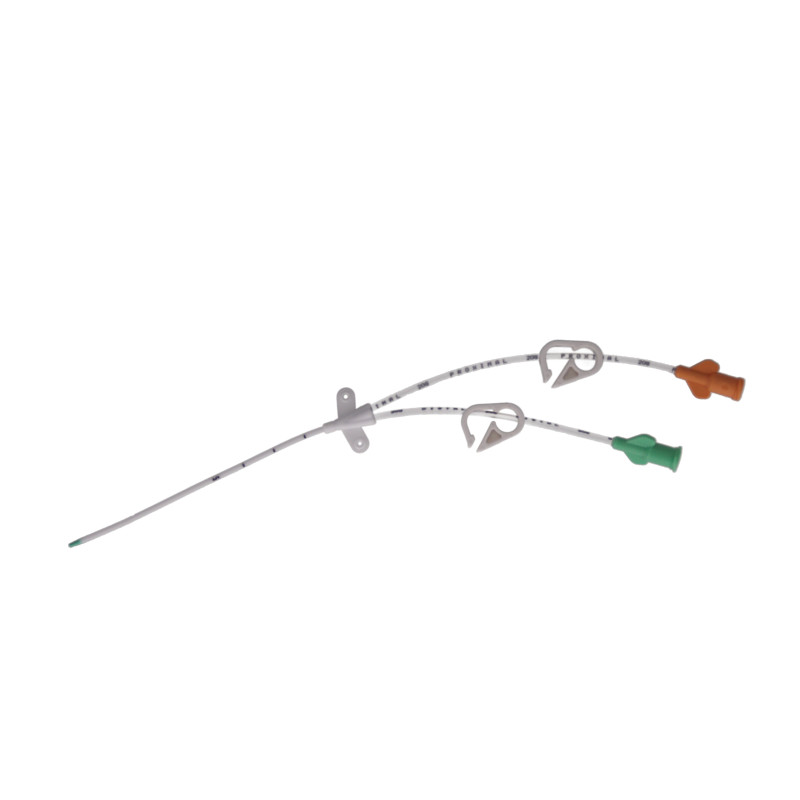 - 1 cathéter bilumière en PUR entièrement radio-opaque avec embase intermédiaire munie d'ailettes de fixation Ø Ext. 1,5 mm - 4,5 Fr - Long. 6 - 8 - 12,5 - 20 ou 30 cm